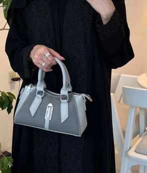 A perfect blend of minimal elegance and everyday function , the Liara Grace handbag is designed for women who appreciate subtle luxury. This structured mini bag features a refined two-tone palette of soft grey and white, accented with silver-tone hardware. The compact yet spacious interior makes it ideal for essentials, while the double-handle design adds a timeless touch to your abaya or casual wear.
